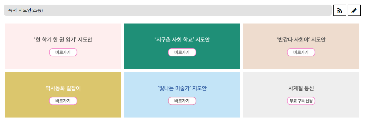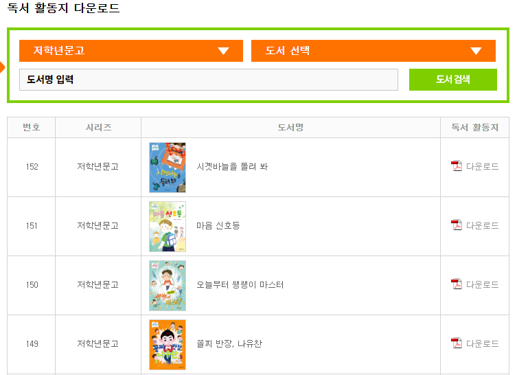특징: 출판사가 아닌 온라인 서점이지만, 도서별로 제공된 독후활동지 링크를 모아 정리해두었습니다. 활동지 외에도 독서교육 자료집이 있어 활용도가 높습니다.
