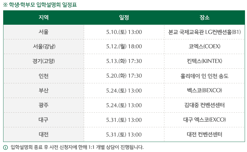 이화여자대학교는 2026학년도 입학을 준비하는 수험생과 학부모님들을 위해 '이화 입학콘서트(학생·학부모 입학설명회)'를 개최합니다. 이 행사는 대학의 전반적인 정보와 입학 전형에 대한 상세한 안내을 제공하며, 1:1 개별 상담을 통해 맞춤형 조언을 받을 수 있는 소중한 기회입니다.